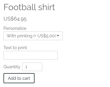 - Flervalg: Gi kundene dine flere valg å velge mellom, f.eks. bestille en fotballdrakt med eller uten trykk. Du kan også angi eventuelle ekstra kostnader.