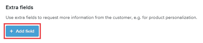 Skriv inn et (beskrivende) navn for det ekstra feltet du skal legge til. Du har også valget om å legge til en forklaring om tilpasningsfunksjonen. Dette kan for eksempel være minste dimensjoner for bilder som skal lastes opp, eller begrensninger for tekstinndata. Klikk på + Legg til forklaring for å fullføre dette, og forklaringen vil vises på produktsiden.