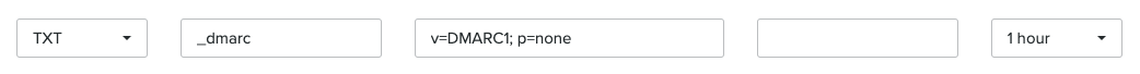 Klikk på knappen + Legg til post for å legge til en ny post, og velg TXT som type. I feltet Navn, skriv inn _dmarc, og i feltet Verdi skriv inn v=DMARC1;p=none;