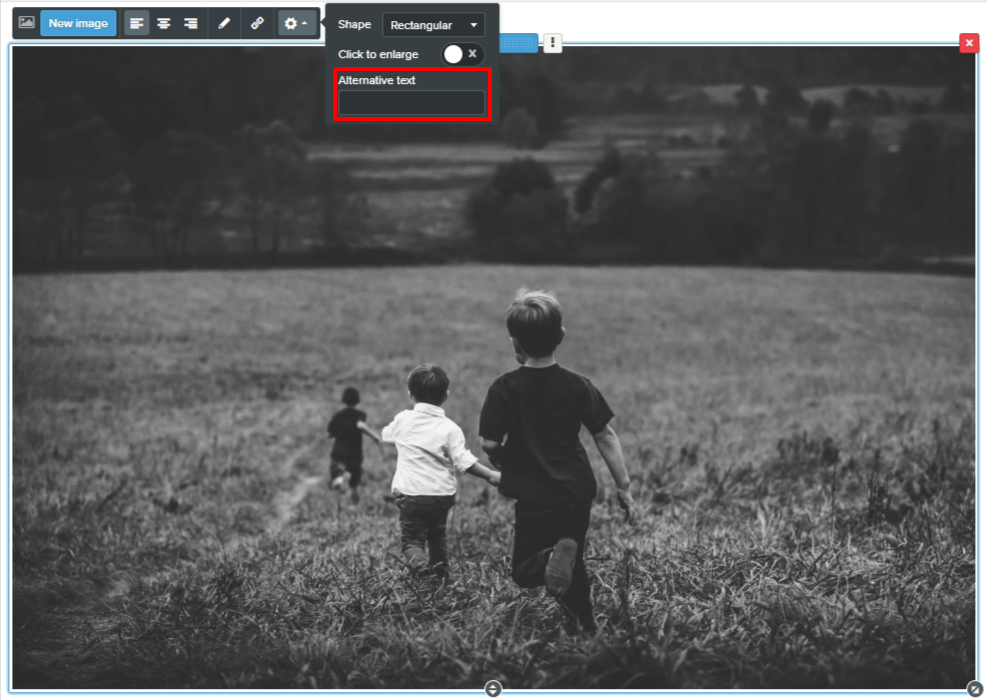 Når du har lagt til et bilde på nettsiden din med bilde-elementet, klikker du på tannhjulikonet i verktøylinjen. Du kan justere formen på bildet her, og nederst ser du en tom linje for “Alternativ tekst”. Der kan du skrive inn alternativ tekst.