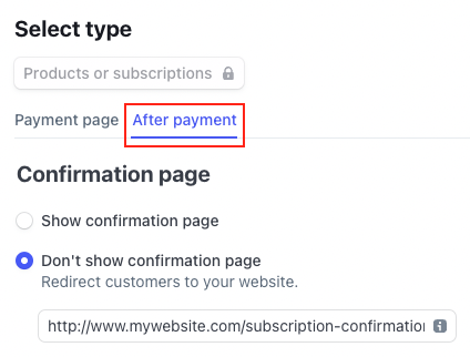 Gå till fliken Efter betalning och aktivera alternativet Visa inte bekräftelsesidan. Ett textfält visas för att omdirigera kunder till din webbplats. Gå tillbaka till din webbplats och använd förhandsgranskningsläget för att besöka sidan dit du vill skicka användare efter slutförd betalning. Kopiera sidans URL från adressfältet i din webbläsare och klistra in den i URL-fältet i Stripe.