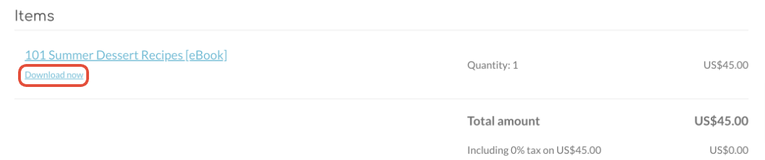 Kunden får ett e-postmeddelande med faktura och beställningsinformation. Längst ner på fakturan finns en länk till den köpta digitala produkten.